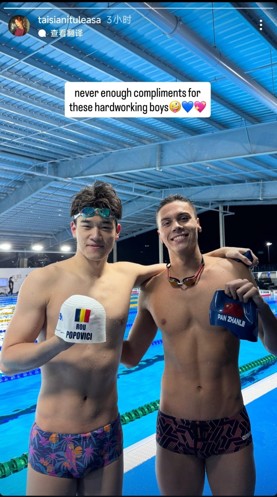 凭借出众颜值和傲人成绩,在新加坡吸引其他运动员粉丝的不止汪顺,在男子100米自由泳比赛期间,罗马尼亚名将波波维奇就与潘展乐交换泳帽,波波维奇女友为两人拍照留影,还说“这些勤奋的男孩,赞美永远都不够”。