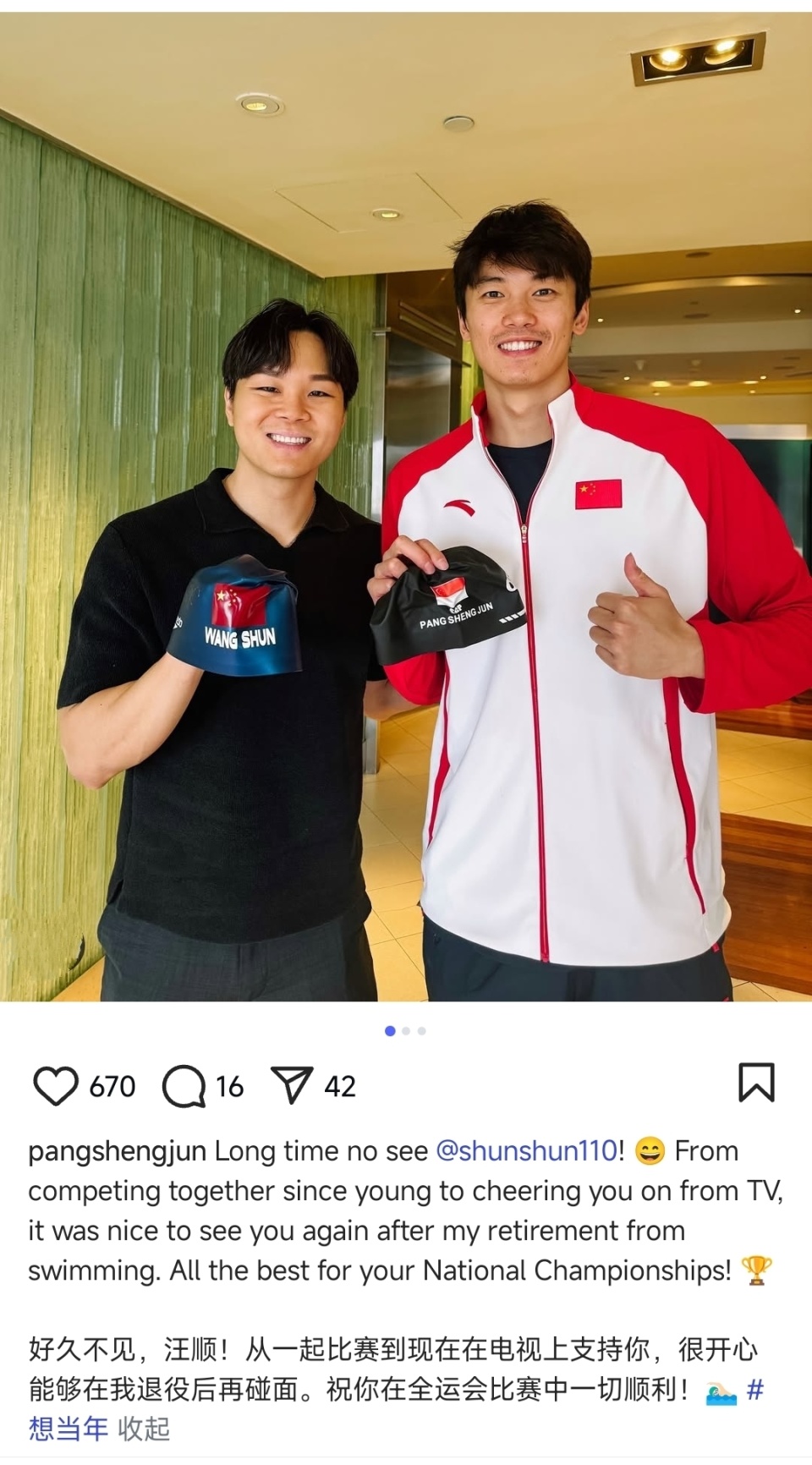 还发布了:“好久不见,汪顺!从一起比赛到现在在电视上支持你,很开心能够在我退役后再碰面。祝你在全运会比赛中一切顺利!”