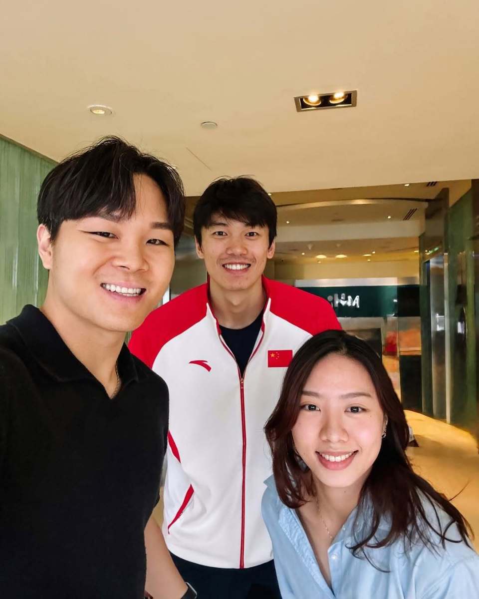 值得一提的是,最后与汪顺和冯盛均一同合影的俏丽女生,则是新加坡羽毛球运动员杨佳敏—冯盛均女友!